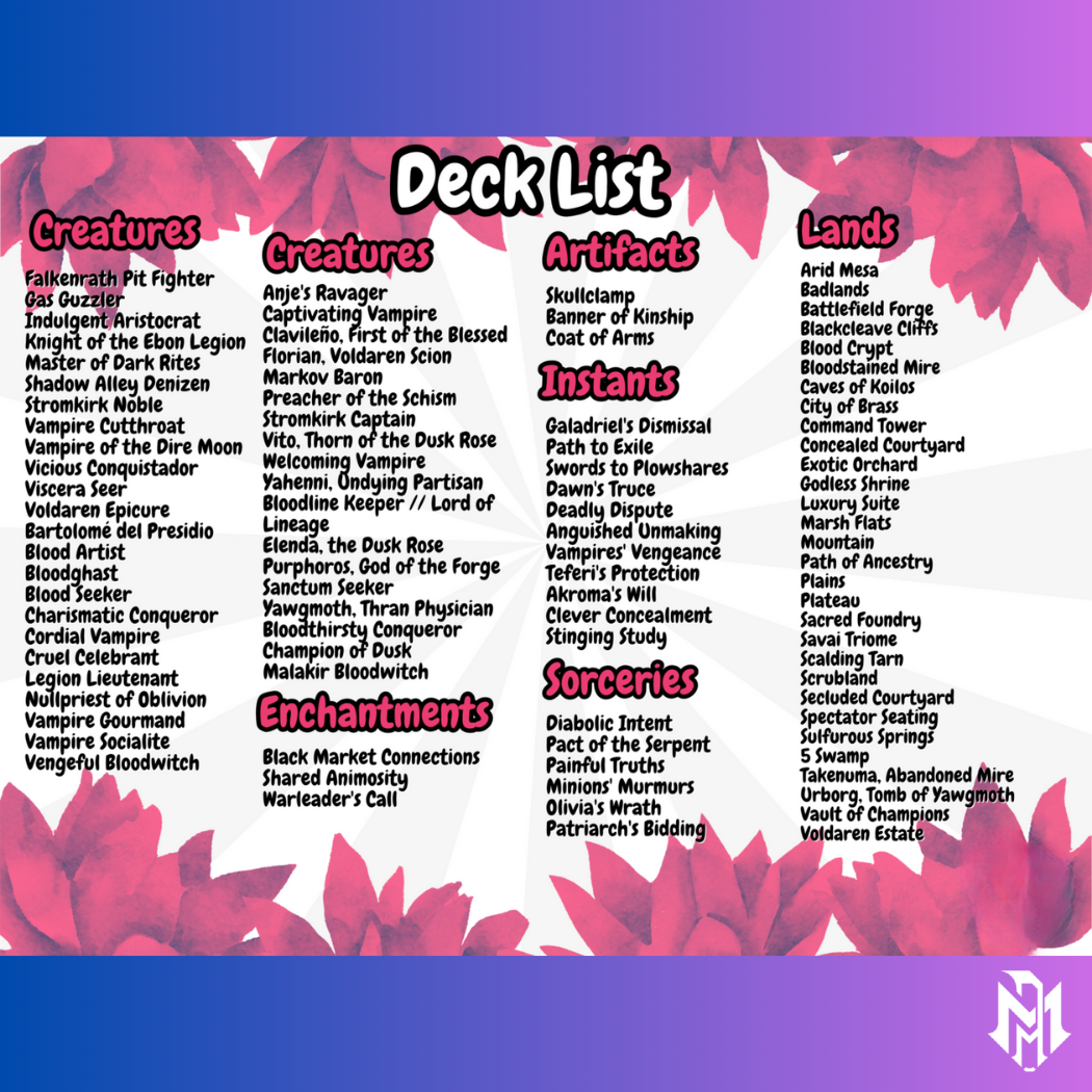 Edgar Markov Vampires specializes in fast token generation and scaling power. The deck ramps early into a swarm of elf creatures that synergize with each other and feed into Edgar Markov Vampires life-drain tap ability.